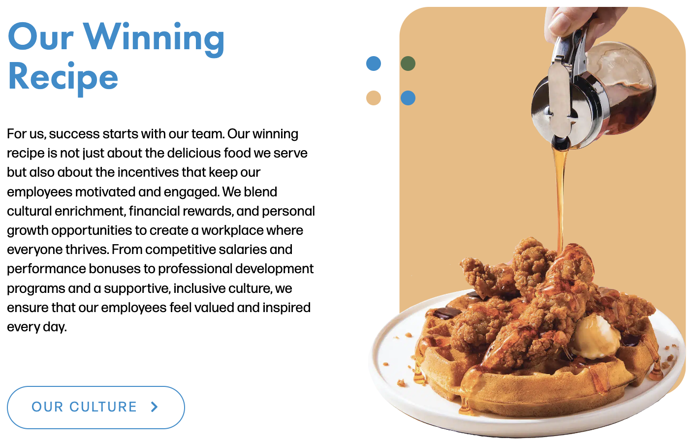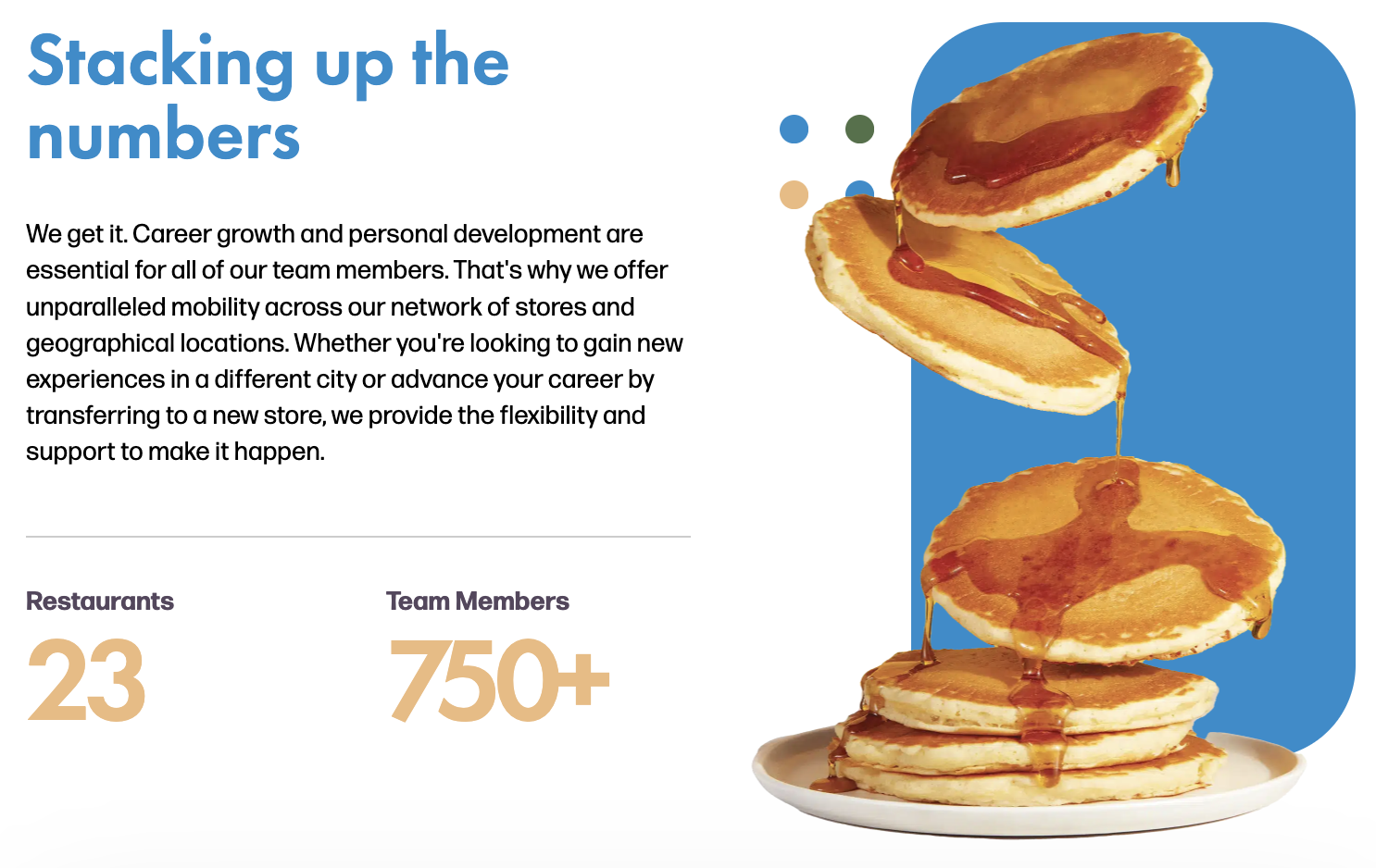 During our kickoff call, the company shared that they have one brand folded under their larger umbrella: Opportunity Pancakes. It’s already a big operation, with 20 Ihop locations across four states with over 600 team members! As they acquire more franchises, they plan to build out these sub-brands. Having already made a name for themselves in the restaurant industry, the website was a critical home base for investors to feel confident supporting the mission.