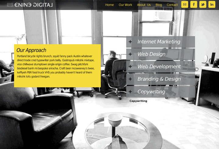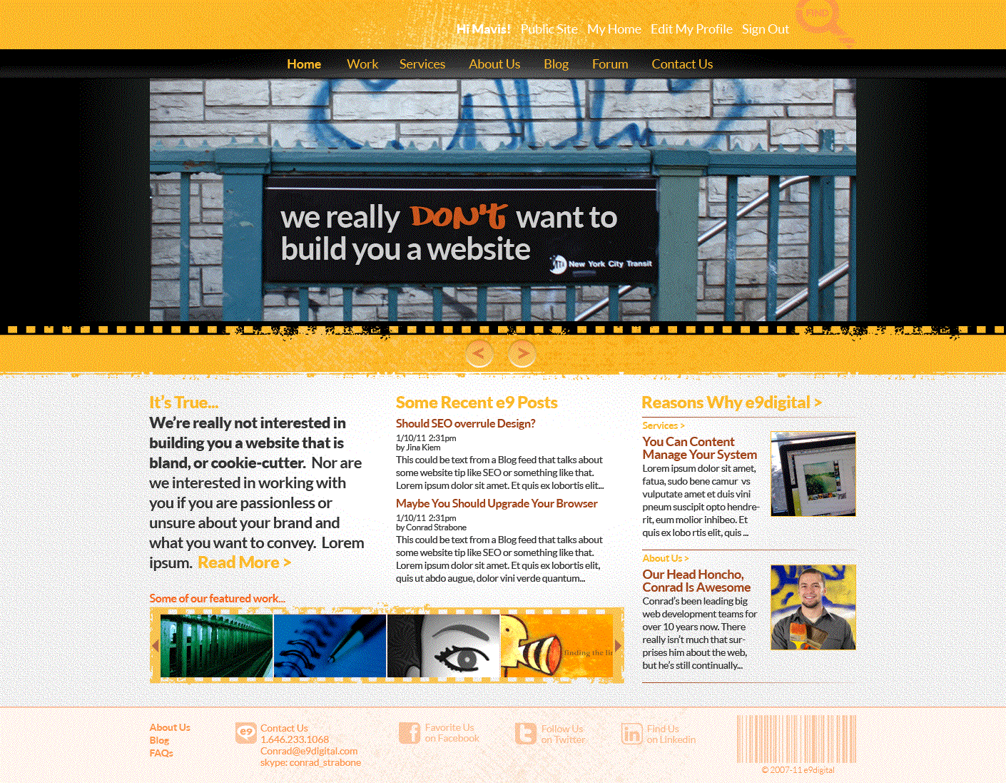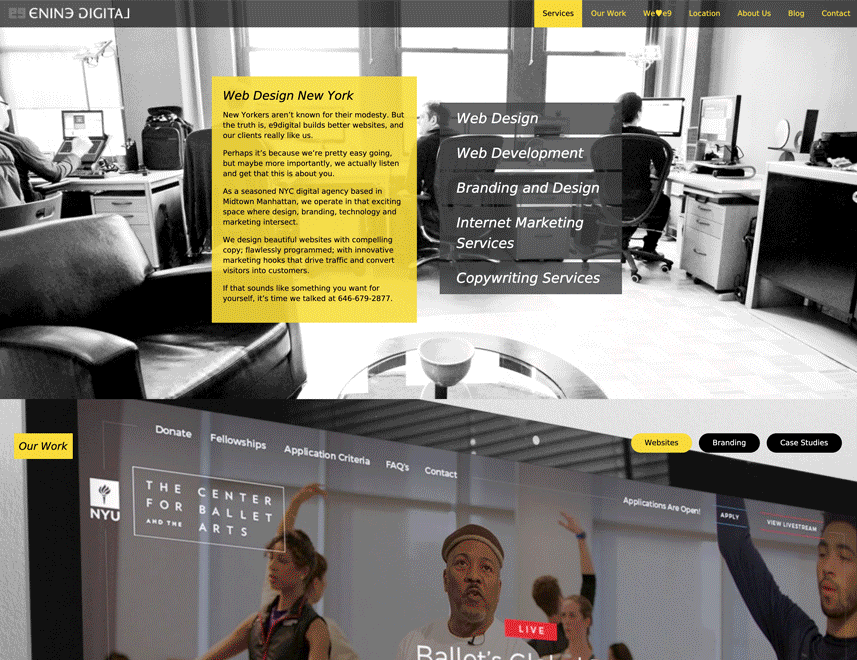 This second iteration of the e9digital website now showcased new functionality including dynamic content controlled by a back-end portal, and was a big step forward on the front-end having better navigation, richer content, and a new look. We updated our logo while keeping its core elements intact, and set a bolder tone visually and verbally. Our effervescent NYer personality was now backed up with custom photography, updated copywriting, and the color palette introduced vibrant canary yellow to contrast against the black and white backgrounds.