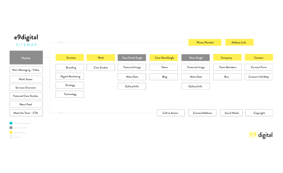 We started by reorganizing the navigation, and informational structure. Once a sitemap was solidified, we began with the design. The essence of e9 has never changed, so we continued along the same path in terms of tone, photography, and messaging. The back-end was created from the bottom up, with carefully thought out structuring, keyword research, metadata organization, and other SEO techniques in full force. The design brought in an additional accent color, this time cyan, which contrasts the black just like the yellow (now we just need magenta to round out the CMYK gamut). The logo received another update, as is tradition, and we added micro-animations, background videos, and hover links to significantly increase user interactivity while creating a circle of engagement that allows visitors to find what they need, and then some.